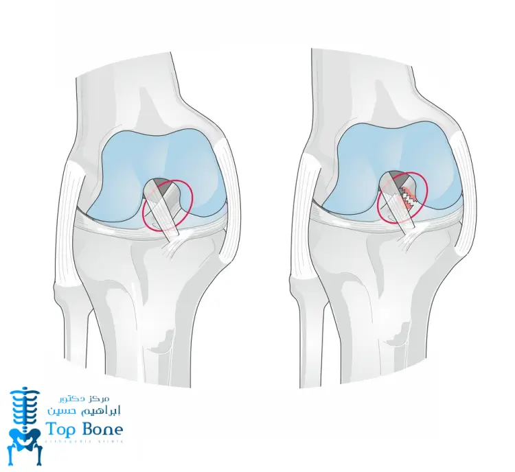 • تنظيف المفصل: يتم فحص المفصل بدقة وإزالة أي أنسجة تالفة أو بقايا من الرباط المصاب.